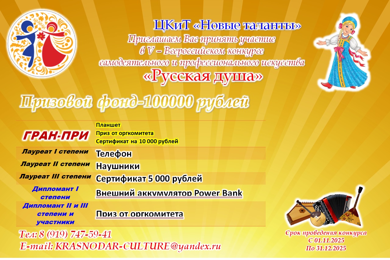 Дополнительную информацию можно уточнить по тел: 8 919 747 59 41 WhatsAppили на электронную почту krasnodar-culture@yandex.ru